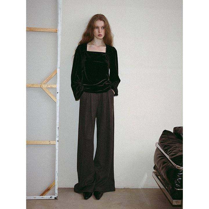 popchrio◆法式复古方v领黑色丝绒衬衫泡泡长袖修身显瘦内搭上衣