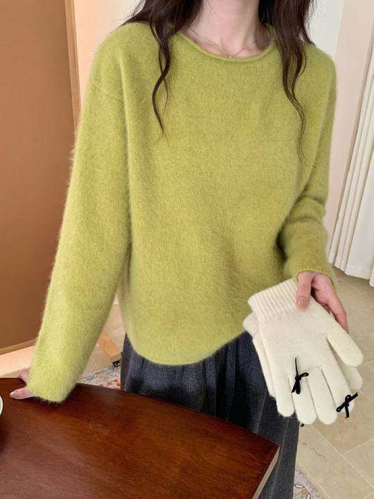 伊人如许 独家定制豆苗绿卷边狐狸绒毛衣 毛茸茸羊毛宽松针织衫