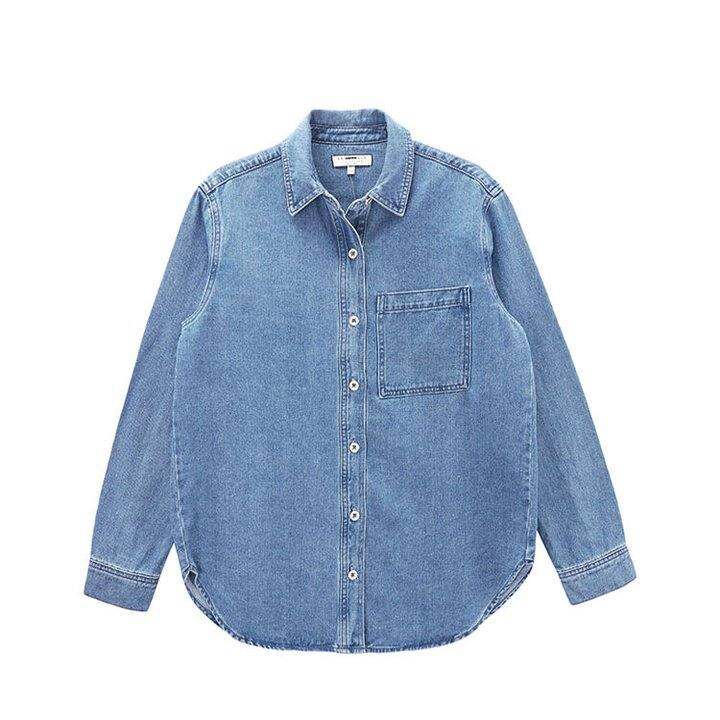 2025春季纯棉长袖翻领衬衫 美式休闲风宽松直筒女装中蓝色磨白
