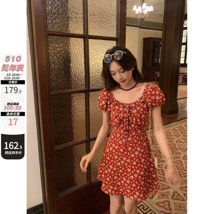 夏天家法式茶歇复古泡泡袖碎花收腰短袖连衣裙女夏季薄款红色裙子