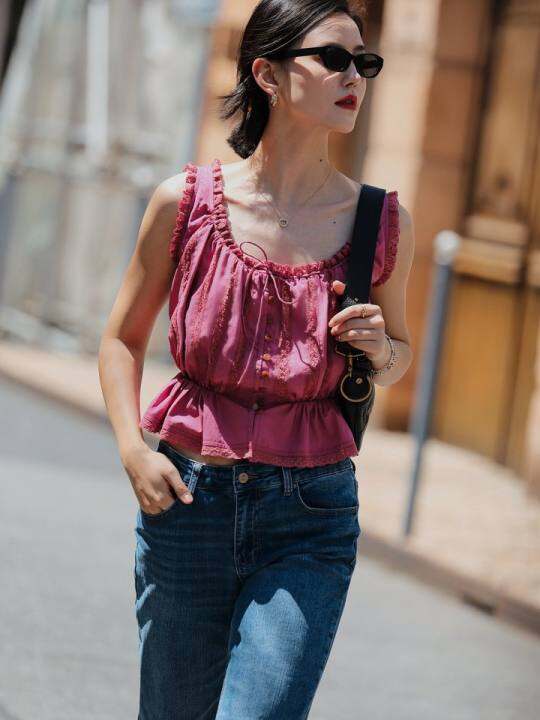 4/11 20:00Damostudio重工拼贴显白梅子粉俏皮木耳边U领背心上衣
