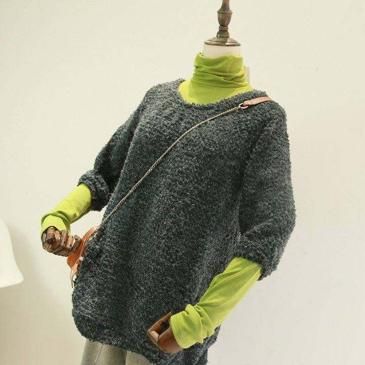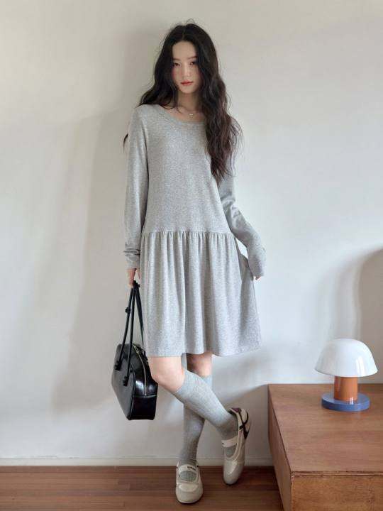 1313慵懒气质花灰色长袖打底连衣裙2025秋女宽松针织缩褶短裙