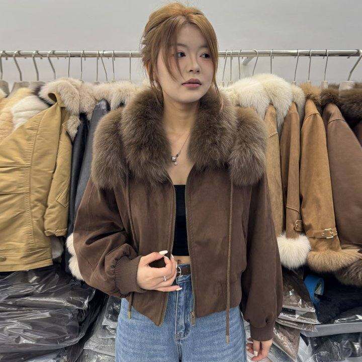 90绒qingshe韩系高端麂皮绒派克短外套女2025大毛领狐狸毛皮草
