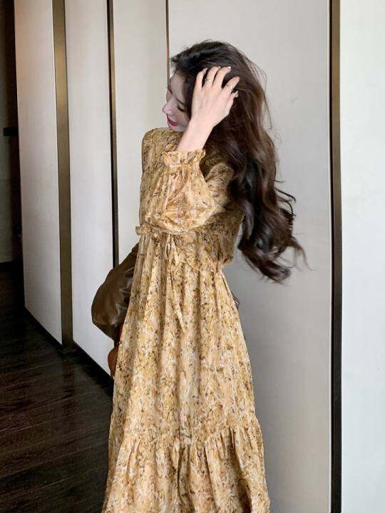 法式长袖碎花连衣裙女春秋2025新款气质显瘦温柔风木耳边茶歇长裙