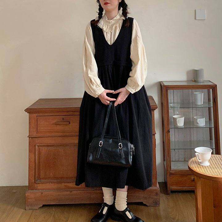 JOENG 复古V领亚麻棉麻背带裙宽松无袖中长款黑色大摆背心连衣裙