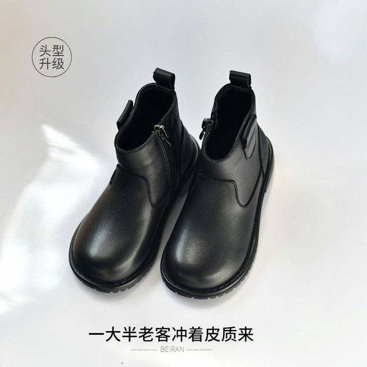 贝然童靴软牛皮真皮短靴女童公主马丁靴黑色中筒潮秋冬款棉靴矮靴