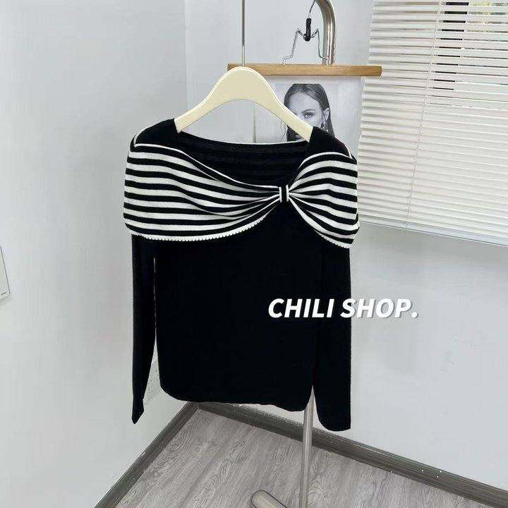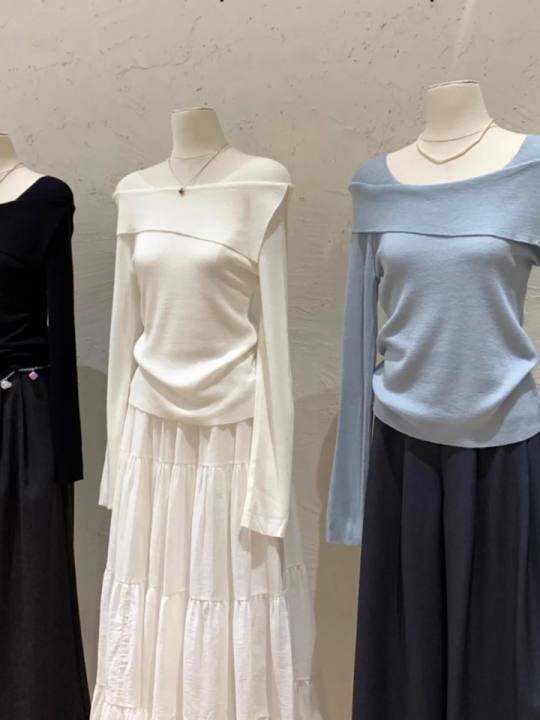 温柔一字肩针织衫上衣女秋冬新款内搭打底衫设计感不规则长袖毛衣