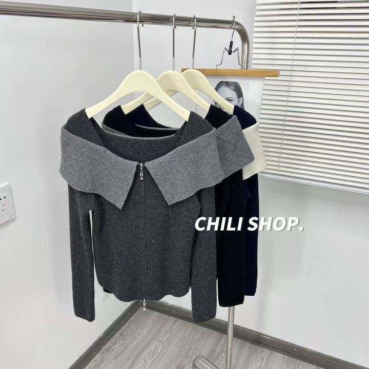 【英英Chili】撞色拉炼一字肩感韩系温柔100全羊毛针织毛衣 10.24