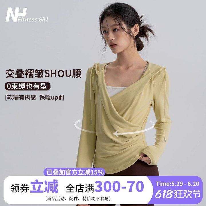 健身女孩新款瑜伽服连帽跑步运动上衣V领收腰显瘦假两件长袖新款