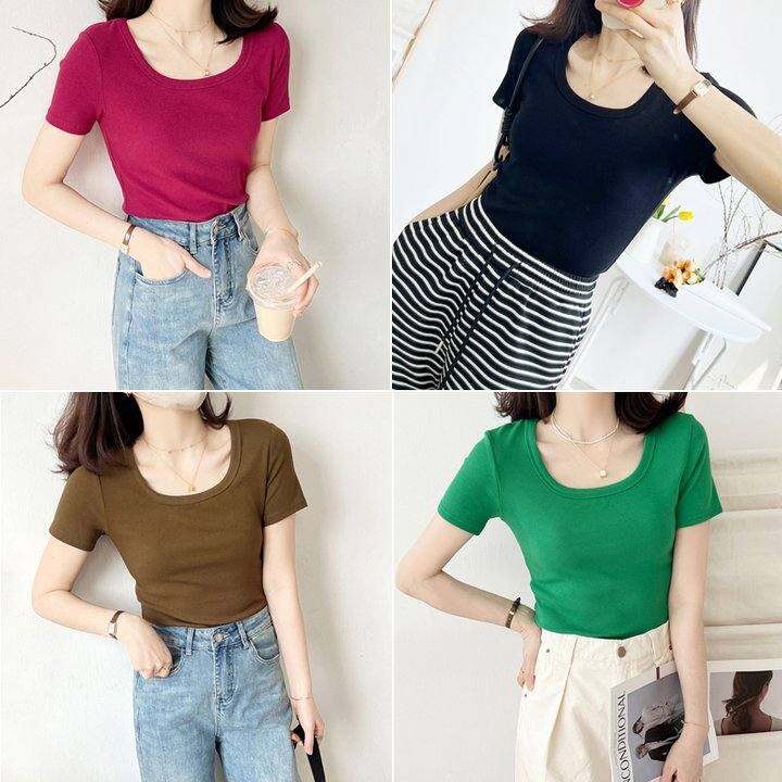 BI入自留款!百搭纯色方领短袖T恤女弹力修身显瘦短款套头螺纹棉T