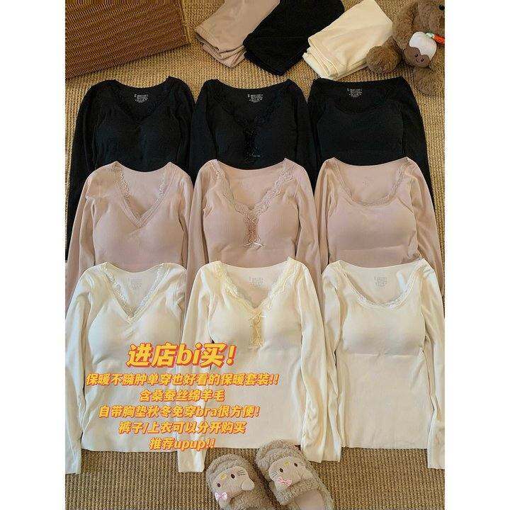 @含桑蚕丝羊绒贴片!自发热带胸垫秋冬加绒加厚蕾丝保暖内衣套装