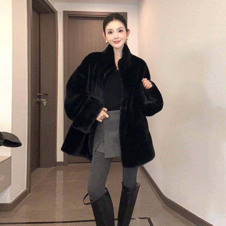 2024冬新款皮毛一体外套女中长款立领环保水貂绒皮草挽袖毛毛大衣