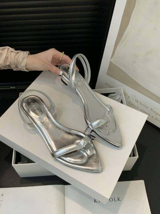 ins潮小众高级感亮金色尖头夹趾显瘦欧美风低跟绑带坡跟凉鞋2024