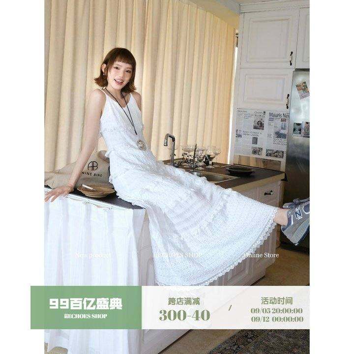 iiECHOES〝云卷云舒〞重工蕾丝吊带长裙女收腰v领白色蛋糕连衣裙
