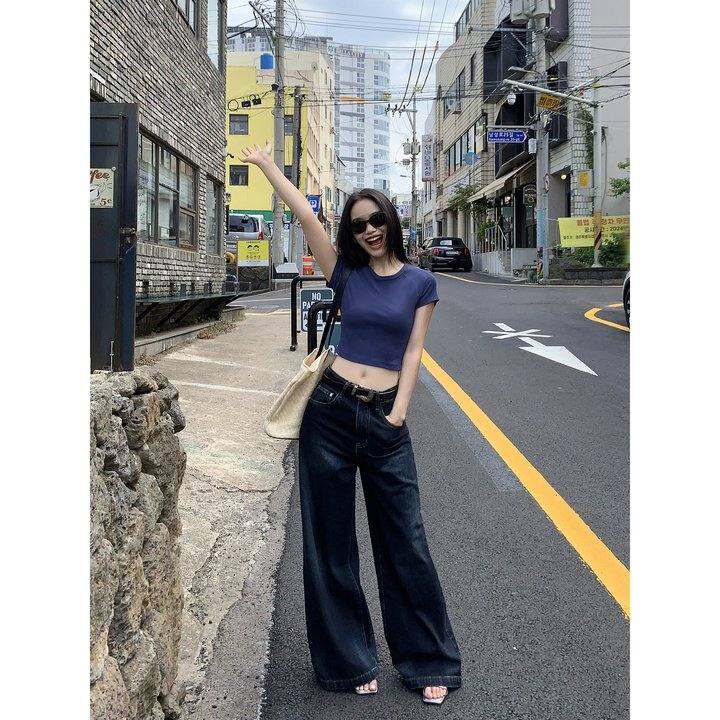 pusumede 黑色复古牛仔阔腿裤女夏季高腰显瘦宽松直筒拖地长裤子