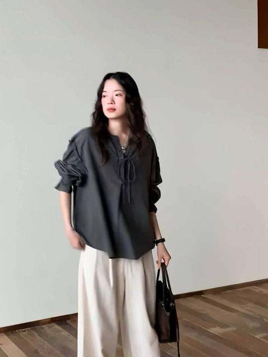 sicily花边拼接V领长袖衬衫女2024秋季新款设计感宽松百搭上衣