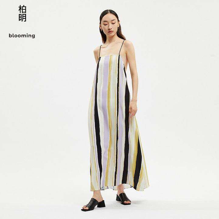 柏明blooming2022年秋季新品女装撞色竖条纹宽松吊带沙滩裙长裙