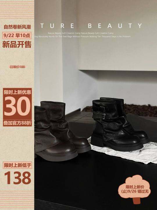 自然卷马丁靴女厚底堆堆短靴2025新款褶皱显瘦裤管靴西部牛仔靴子