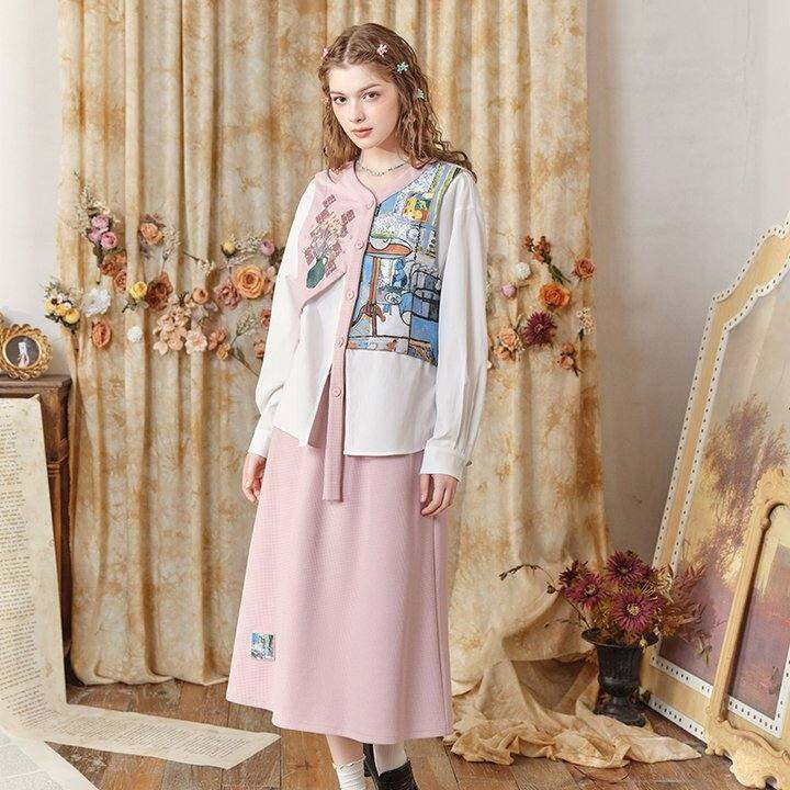 两三事森系套装女两件套2025春季新款印花设计感衬衫半裙落樱画廊