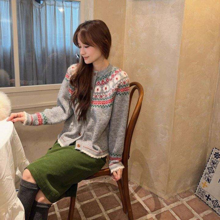 MONASI/2025秋冬圆领费尔岛毛衣上衣绿色半身裙中裙套装复古法式
