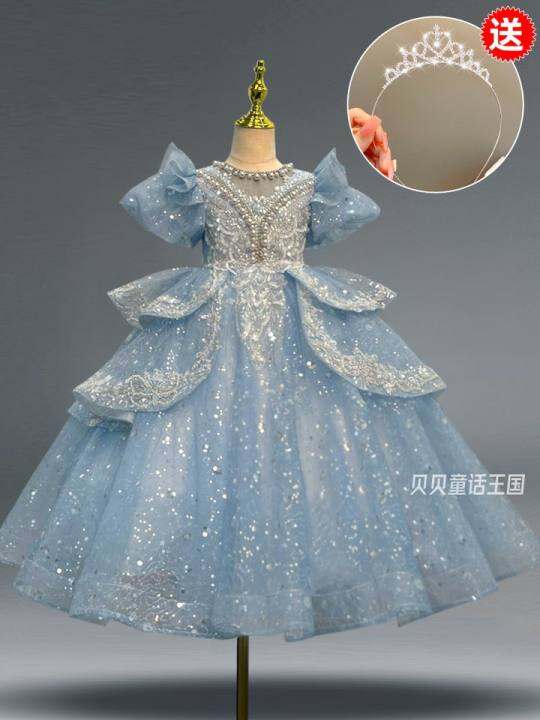 女童高端轻奢蓝色礼服儿童夏季新款重工公主裙花童婚礼走秀演出服
