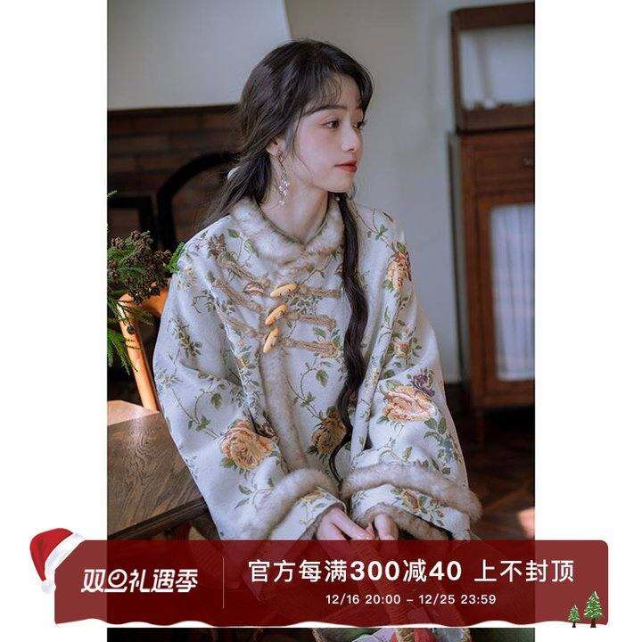 南风谷【松莺】复古绣花改良旗袍连衣裙新中式提花加绒外套女秋冬