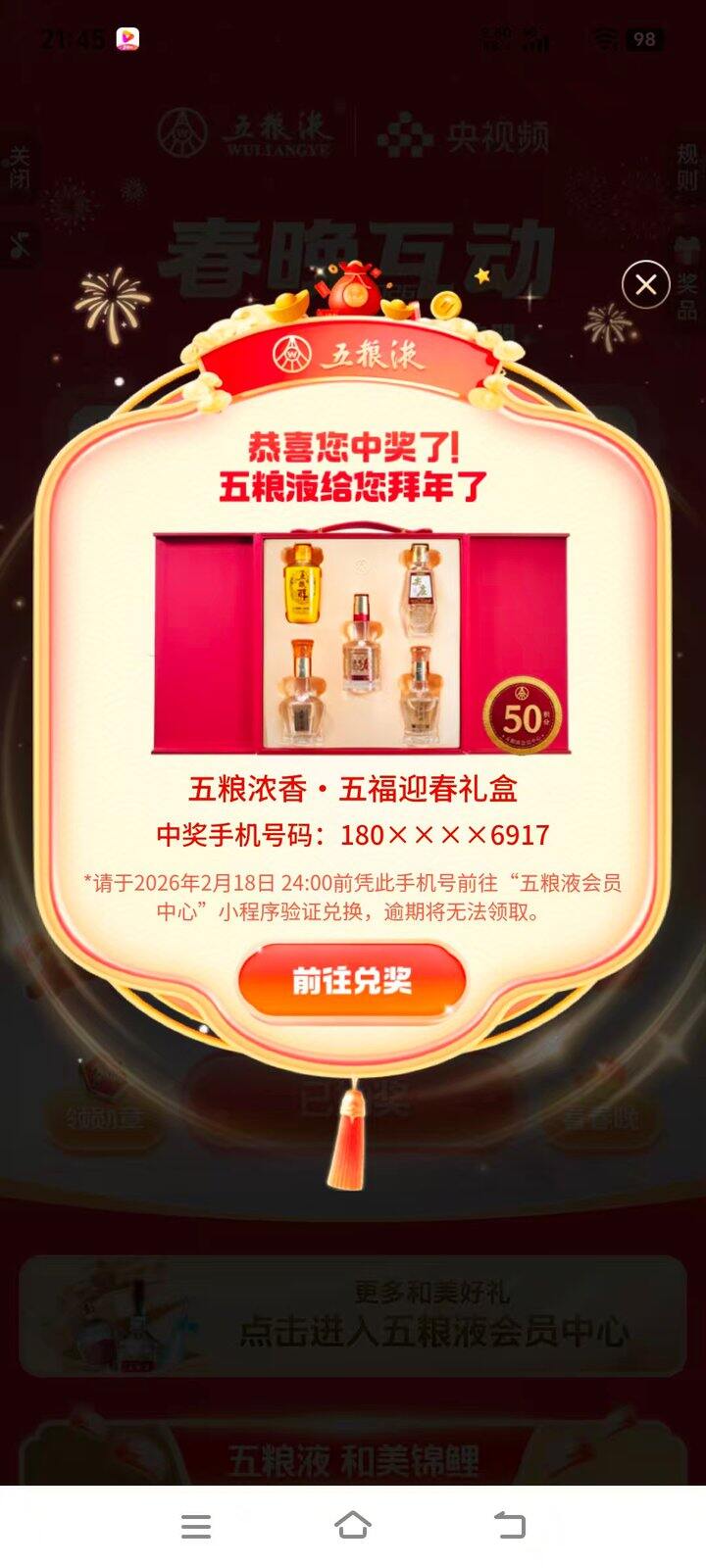 陪爸爸看春晚,索性是全部要看完的,就一起参与活动玩一玩。他刚刚中了一份五粮液!本命年,运气真好啊