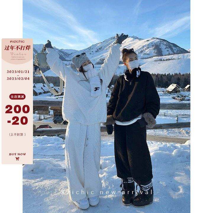 Xzichic懒人穿搭菱形格休闲裤圆领套头卫衣女时髦棉服套装冬季