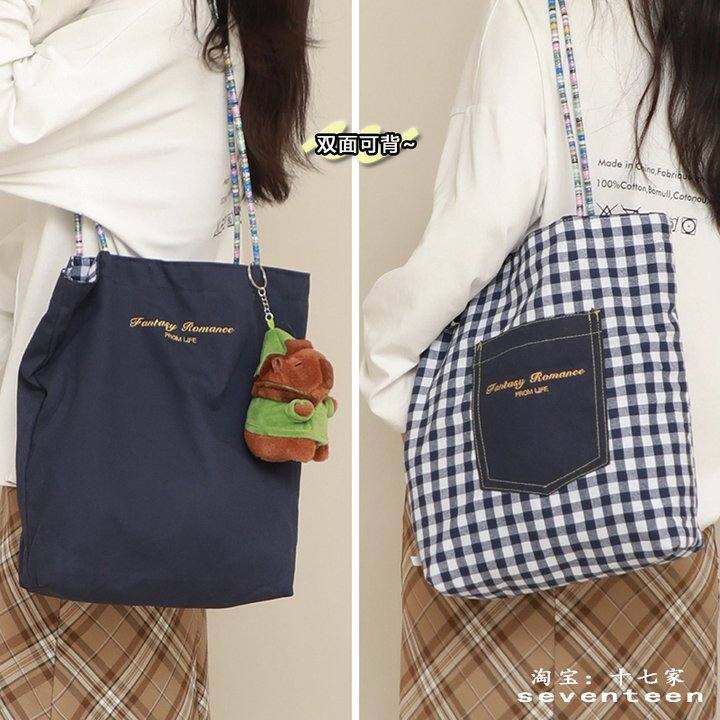 十七家美式双面格子帆布包包女2025春新款复古大容量单肩托特包