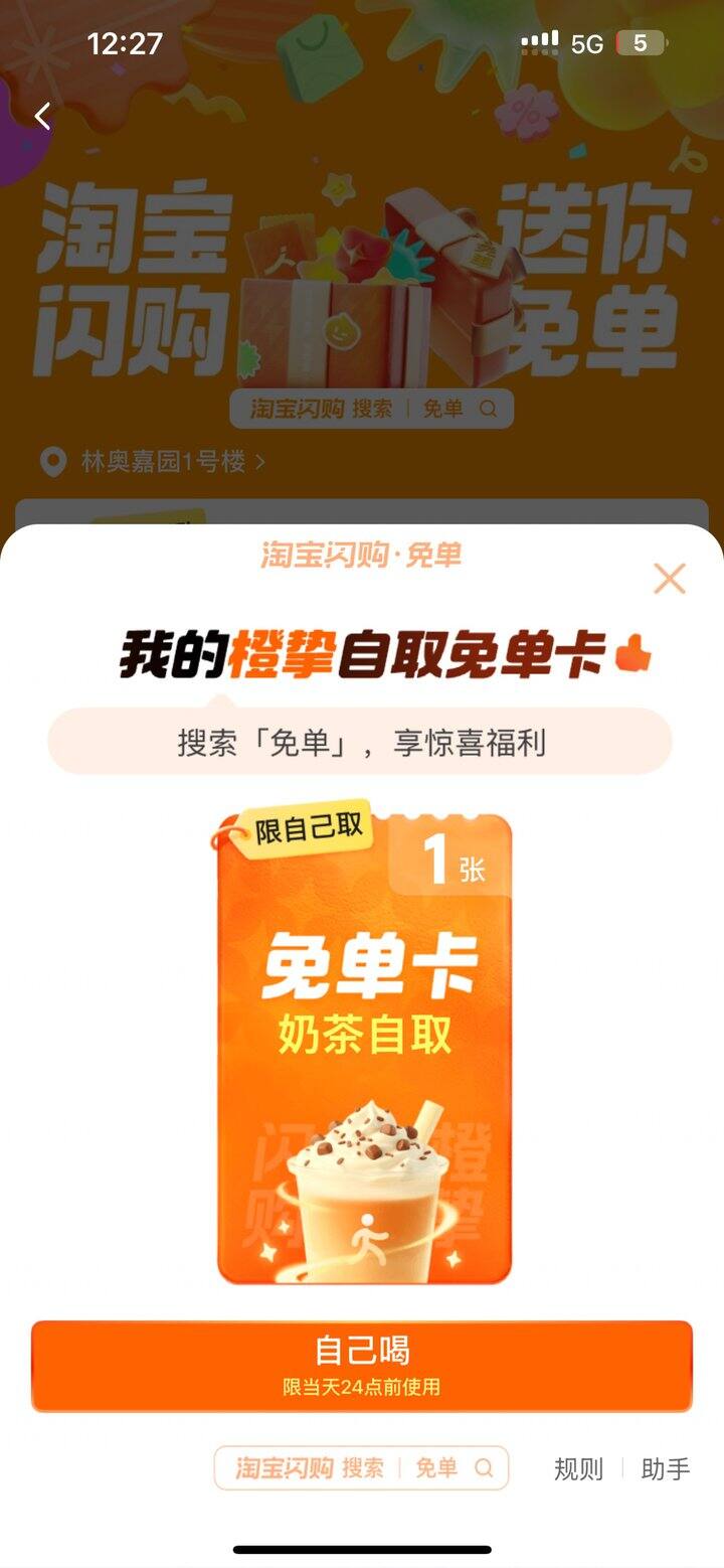 饿了么app首页上方抽免单奶茶,我抽到啦!100万份,可以试试