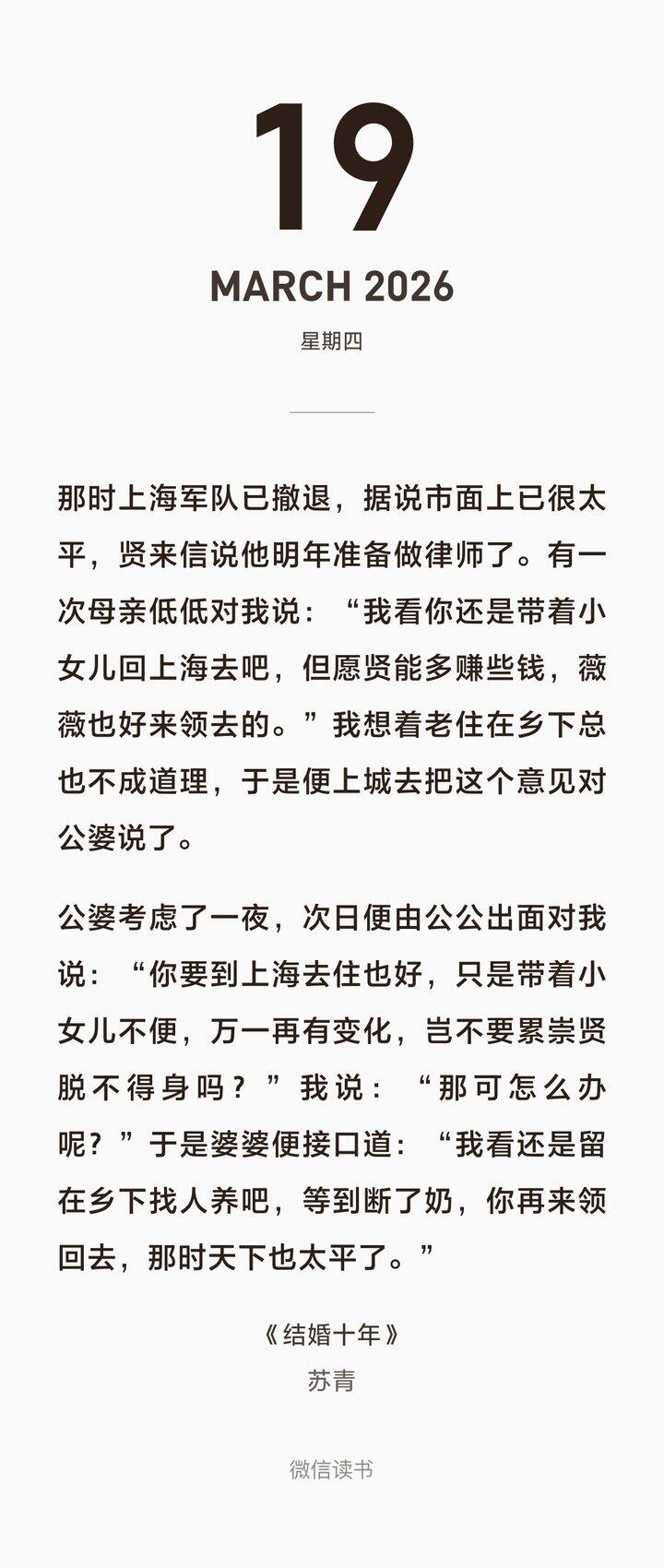 苏青的结婚十年,看得手不释卷,写得非常细腻,带了不少女性主义意识。生完娃看又尤其有感触,那时候重男轻女,生了女儿婆家不允许她喂奶,就为了能尽快恢复例假好再怀下一胎,自己有奶涨着难受,宝宝却要被抱走去喝奶妈的奶。奶妈自己生了孩子要被丈夫扔到福利院,被赶出来做奶妈挣钱给丈夫还债。