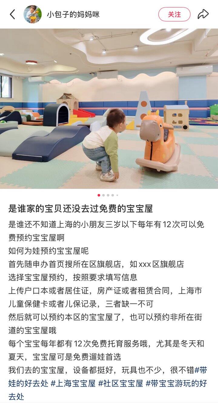 来上海出差听同事们说上海有宝宝屋这种好东西,一年12次免费,多出来的话50块钱两小时,幼儿园有三四个老师陪着,一般10个小孩子,里面有很多玩具设施,跟托班唯一区别就是少顿饭