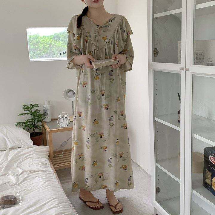 2024年新款棉绸女睡裙短袖防凸点长裙到脚踝高个子连衣裙子睡衣