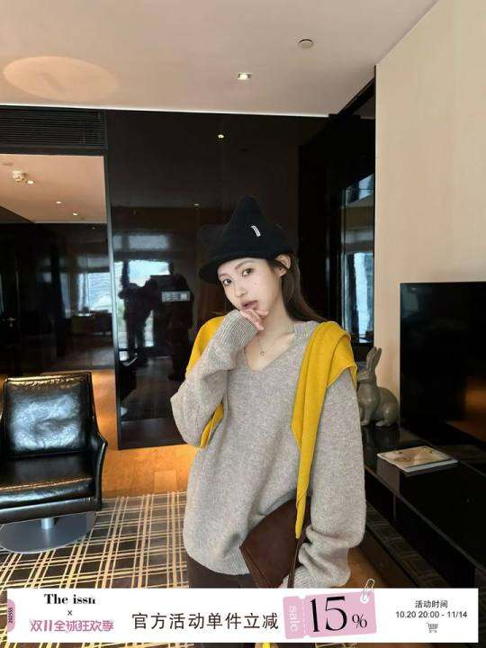 宁司 卡其色V领套头长袖针织衫女秋季慵懒风宽松显瘦简约百搭上衣