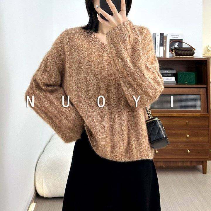 405g 重工花纱拉绒羊毛套头毛衣2025秋冬宽松V领针织衫绞花慵懒风