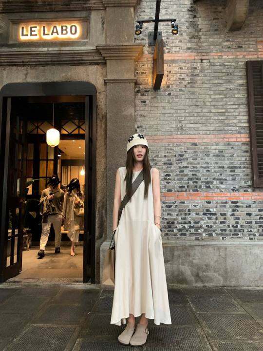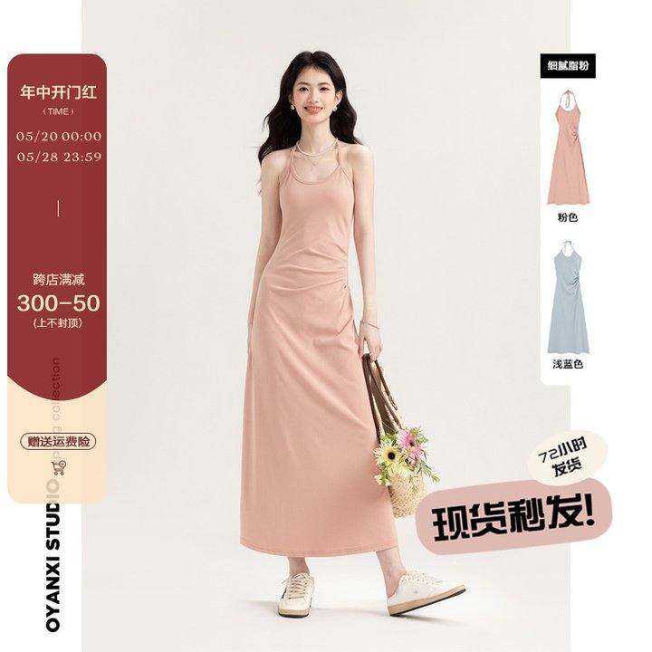 欧阳喜《细腻脂粉》春季简约纯色吊带长裙百搭高腰显瘦连衣裙套装
