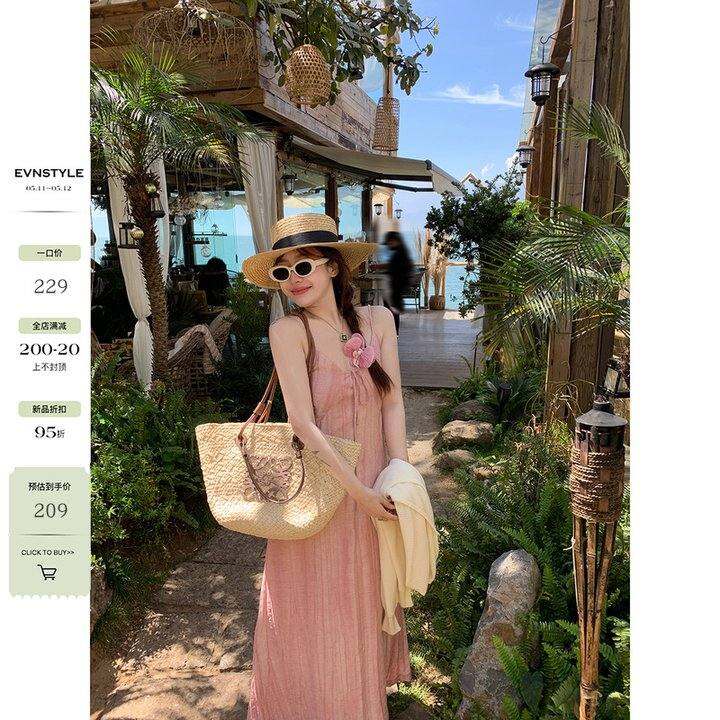 EVNSTYLE “治愈柔和桃”V领压皱中长款天丝亚麻吊带连衣裙度假裙