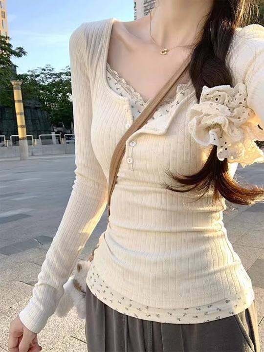 韩系假两件碎花打底衫女内搭纯欲春季2024新款长袖t恤甜辣小上衣