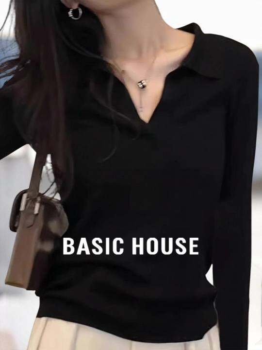 Basic House/百家好气质黑色V领长袖含羊毛针织衫毛衣女2025秋冬