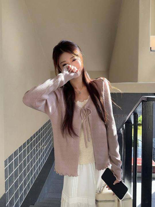三木子自制~温柔风假两件长袖针织衫女早秋季甜美设计感内搭上衣