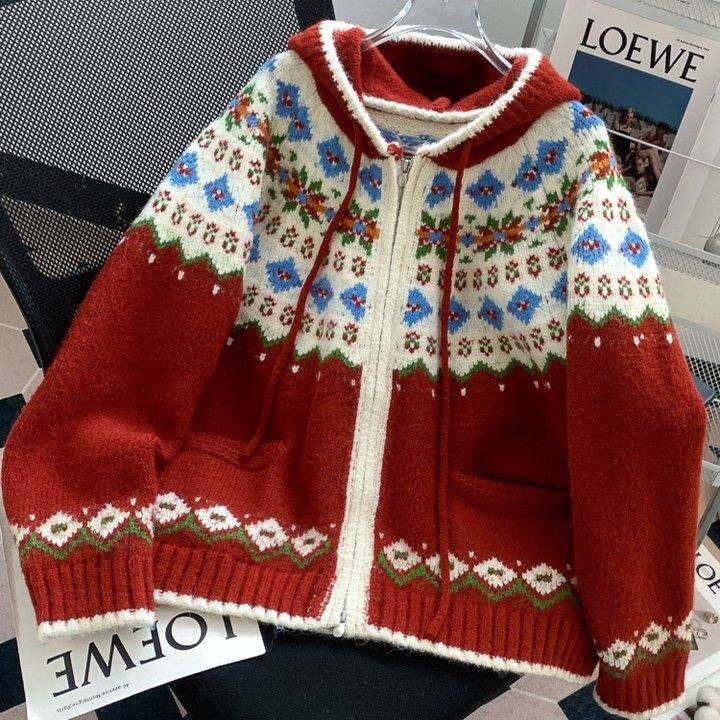 费尔岛宽松连帽红色新年衣服女款毛衣外套2025新款穿搭慵懒风开衫