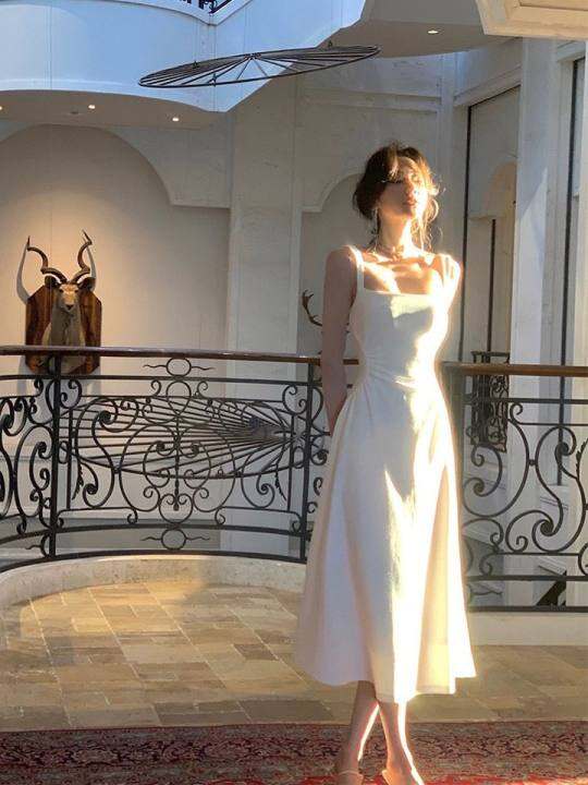 从一时刻 白色吊带连衣裙2024女新款方领法式收腰小众领证长裙子