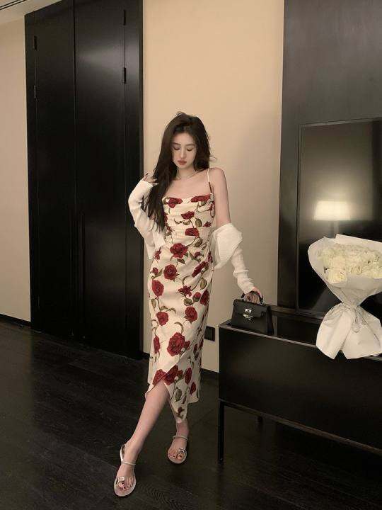 邱肉瑶2024年夏季新款碎花紧身性感吊带连衣裙女显瘦纯欲风中长裙
