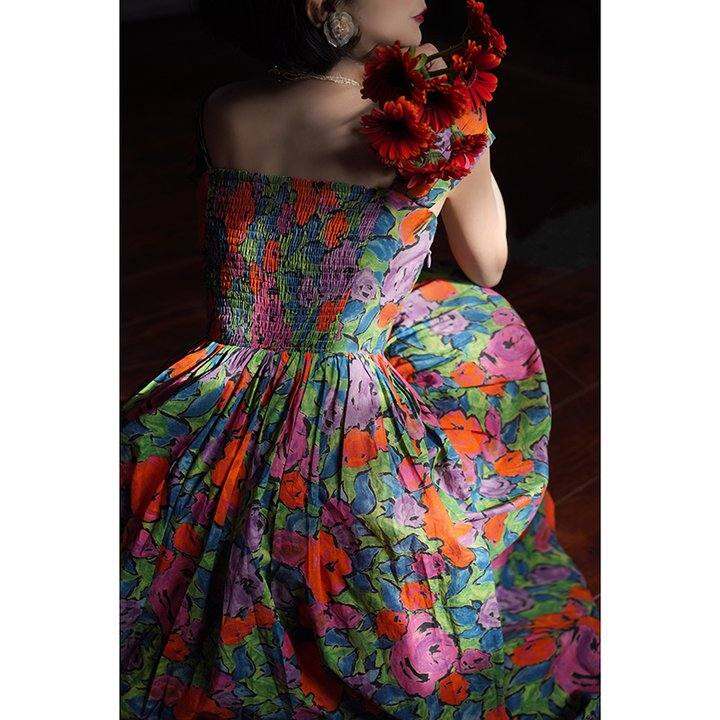 Ching's 法式订染花型饱和色彩连衣裙 高腰优雅一字领A字大摆裙夏