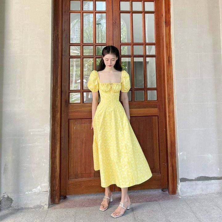house of cb 夏季低胸方领泡泡袖鱼骨法式碎花修身开叉度假连衣裙