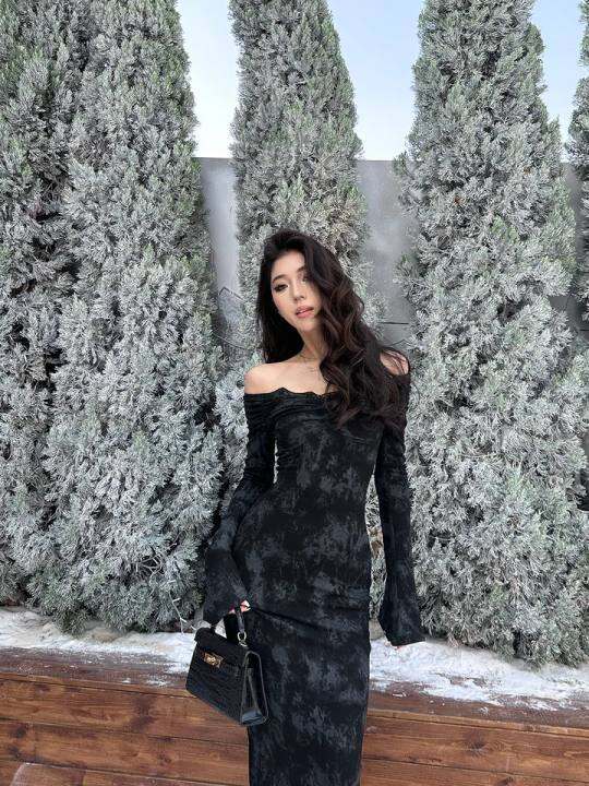 罗哥的羊毛卷 秋冬高级设计感御姐风收腰一字肩褶皱过膝连衣裙女