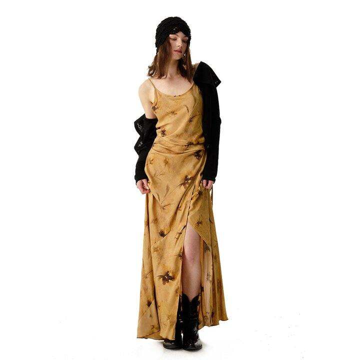 洛边 一眼沦陷 原创香云缎新中式晕染印花吊带连衣裙系带复古开叉