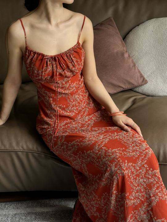 尹太阳原创|复古橘红碎花系带打缆修身长款春夏度假吊带连衣裙