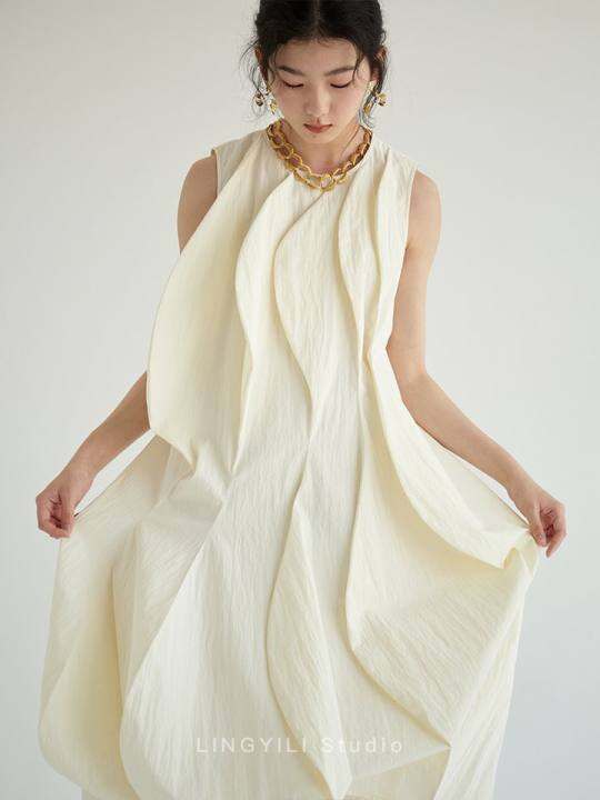 LINGYILI夏新款原创波浪造型立裁无袖圆领设计师款米色长款连衣裙