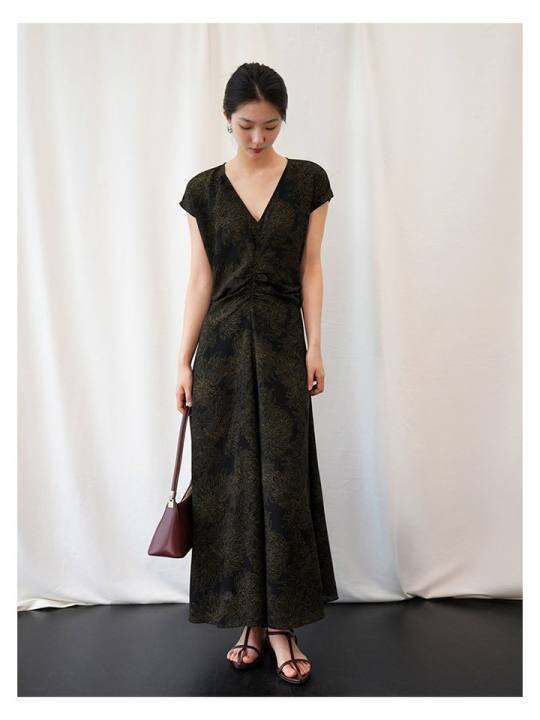 设计感抽褶!复古撞色印花收腰连衣裙女《UXZM061